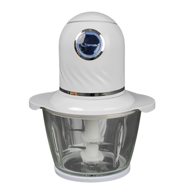 Mini Hachoir Topmatic - Puissance: 𝟑𝟎𝟎 𝐖𝐚𝐭𝐭𝐬 - Capacité du Bol: 𝟏.𝟔𝐋 - Couvercle et bol en verre - Matériau de la lame : 𝐀𝐜𝐢𝐞𝐫 𝐢𝐧𝐨𝐱𝐲𝐝𝐚𝐛𝐥𝐞 - Nombre de vitesses: 𝟐 - Tranchez, coupez, hachez vos différents aliments avec ce mini hachoir multifonction - Couleur: Blanc - 𝐆𝐚𝐫𝐚𝐧𝐭𝐢𝐞 : 𝟏𝐚𝐧