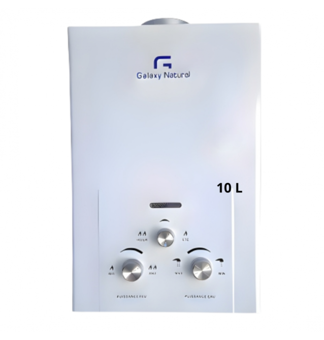 Chauffe Bain Galaxy 𝐆𝐚𝐳 𝐧𝐚𝐭𝐮𝐫𝐞𝐥 (Gaz de ville) – Débit maximum d’eau chaude: 𝟏𝟎 𝐋 – Réglage facile de la température de l’eau – Forme compacte avec un design élégant – Couleur: Blanc – 𝐆𝐚𝐫𝐚𝐧𝐭𝐢𝐞 : 𝟏 𝐚𝐧