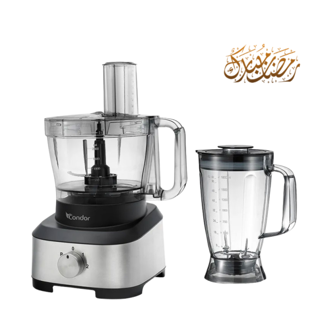 Condor Robot Multifonction Versa Chef - Puissance : 𝟏𝟎𝟎𝟎𝐖 - Capacité Du Bol : 𝟑.𝟔𝐋 - Nombre de vitesse : 𝟐 𝐕𝐢𝐭𝐞𝐬𝐬𝐞𝐬 - Nombre de Fonction : 𝟏𝟐 𝐅𝐨𝐧𝐜𝐭𝐢𝐨𝐧𝐬 - Commande : Bouton rotatif - Capacité bol Blender : 𝟏.𝟖 𝐋𝐢𝐭𝐫𝐞𝐬 - Accessoires : fouet / batteur/ bol/disque/hachoir - Couleur : Silver - 𝐆𝐚𝐫𝐚𝐧𝐭𝐢𝐞 : 𝟏 𝐚𝐧